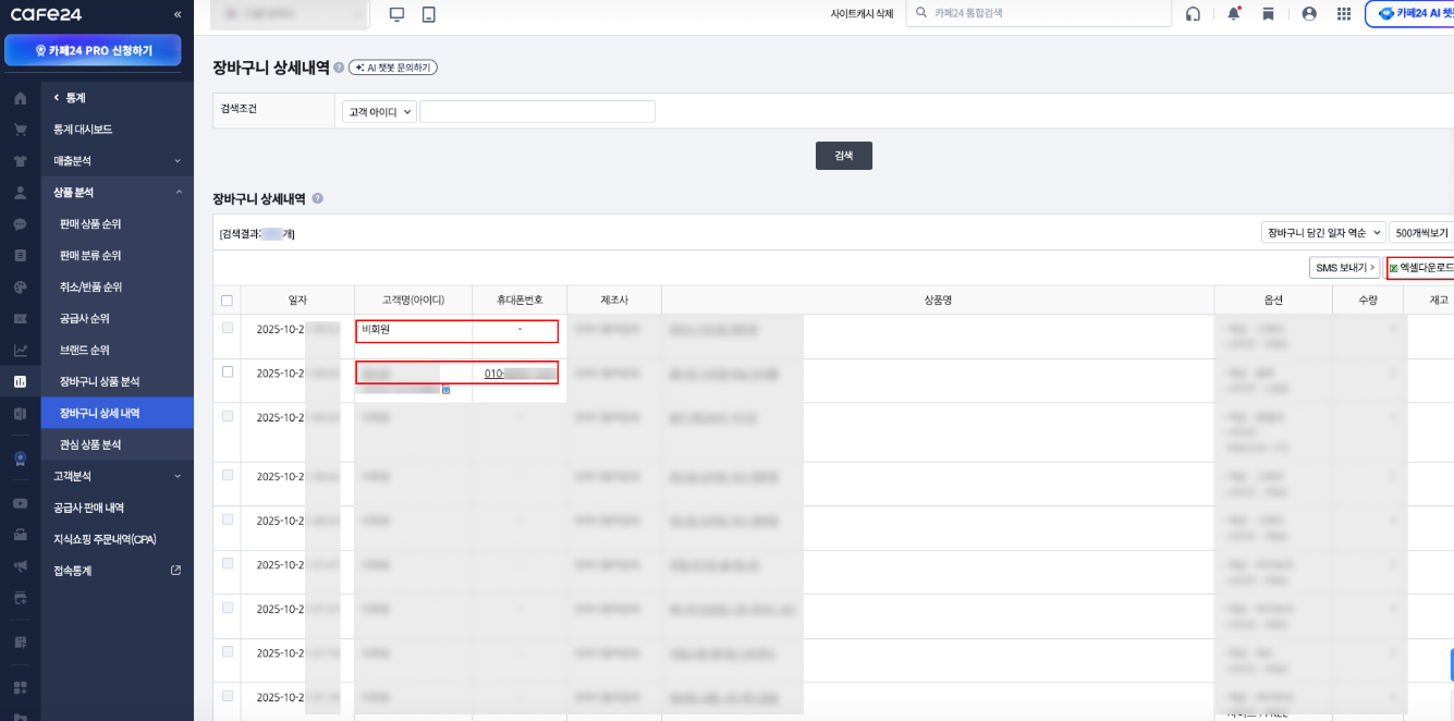 [통계] → [상품 분석] → [장바구니 상세 내역]에서