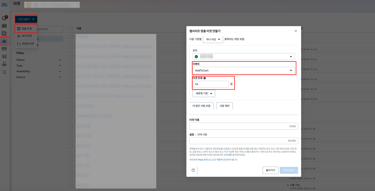 좌측 [타겟] → [타겟 만들기] → [맞춤 타겟] 클릭.