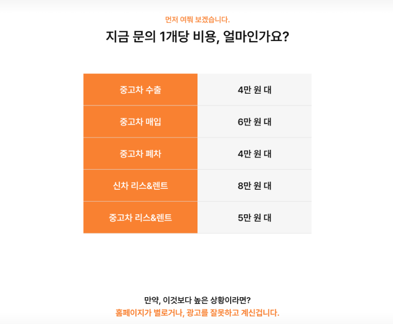 지금까지 대표님이 하고 계셨던 중고차 마케팅 상황은 어떤가요? 현재 문의 당 비용이