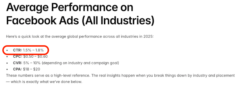 먼저 체크해 봐야 할 것은 CTR(클릭률)입니다. adbacklog의 25년도 메타 광고 보