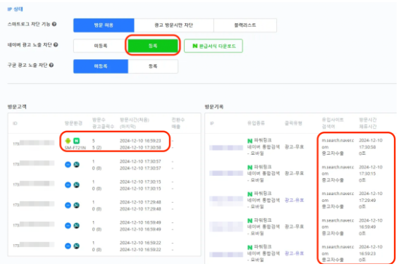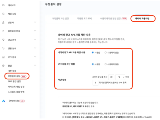 스마트로그 → 환경 → 부정클릭 설정 → 네이버 자동차단