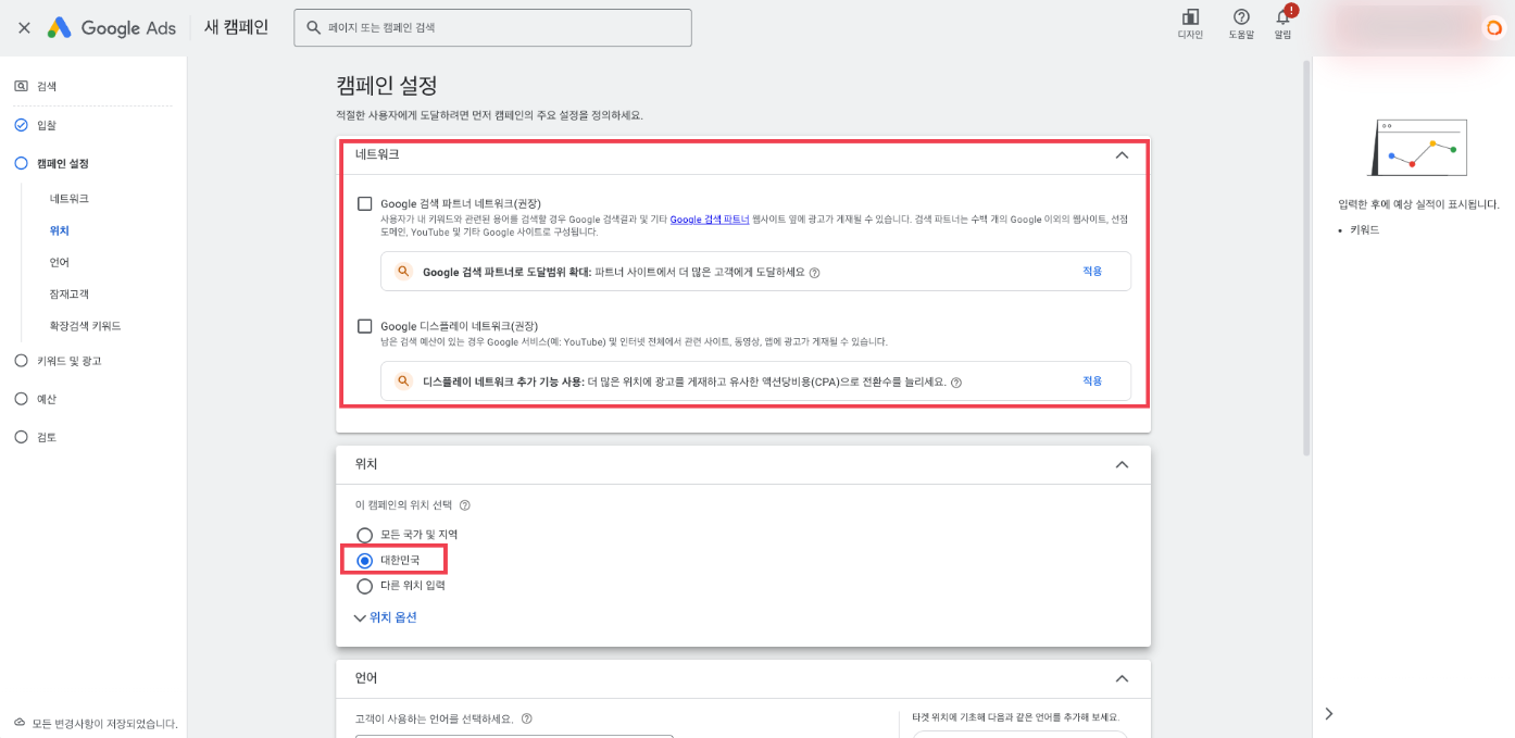 광고 노출 위치는 대한민국을 선택하고 다음으로 넘어가겠습니다.