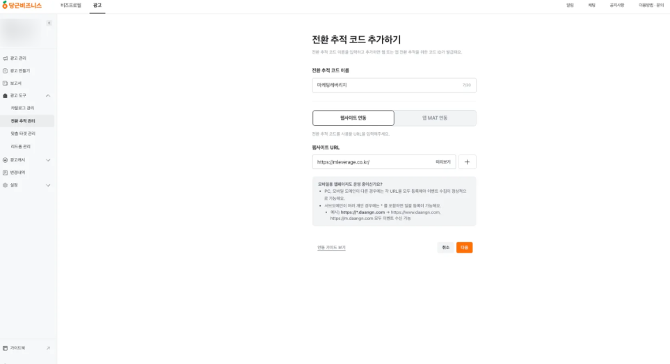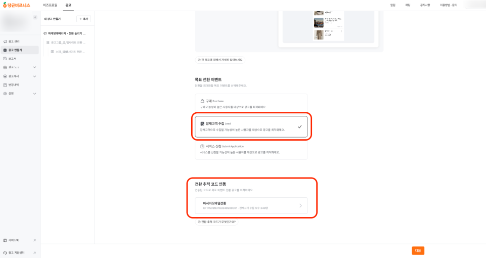 전환 추적 코드를 선택해 주고 다음을 눌러주세요.