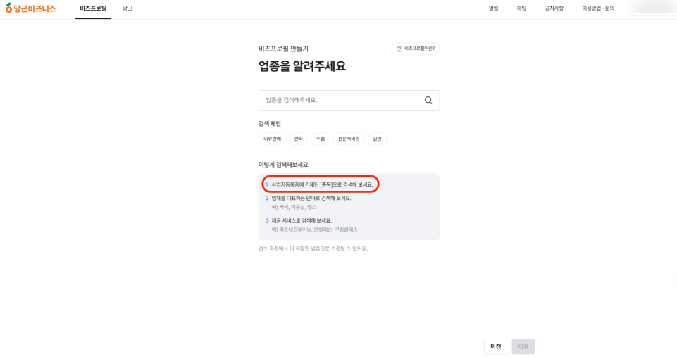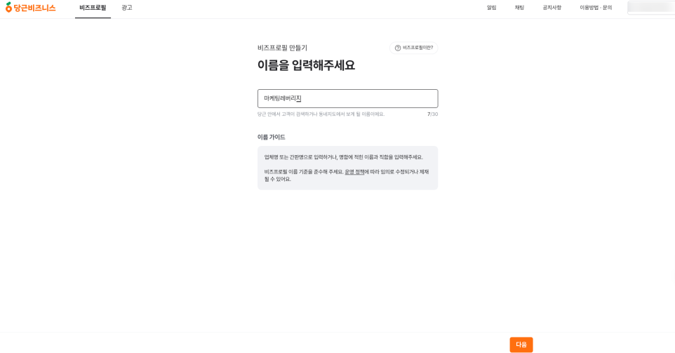 이름, 업종, 주소를 적고 다음을 눌러주시면