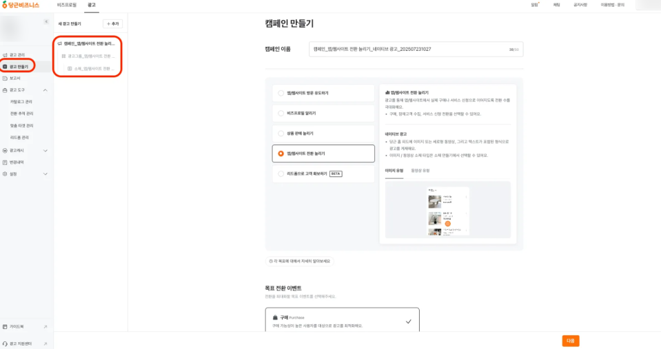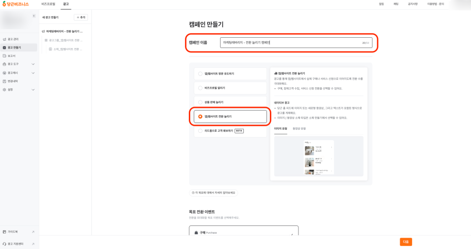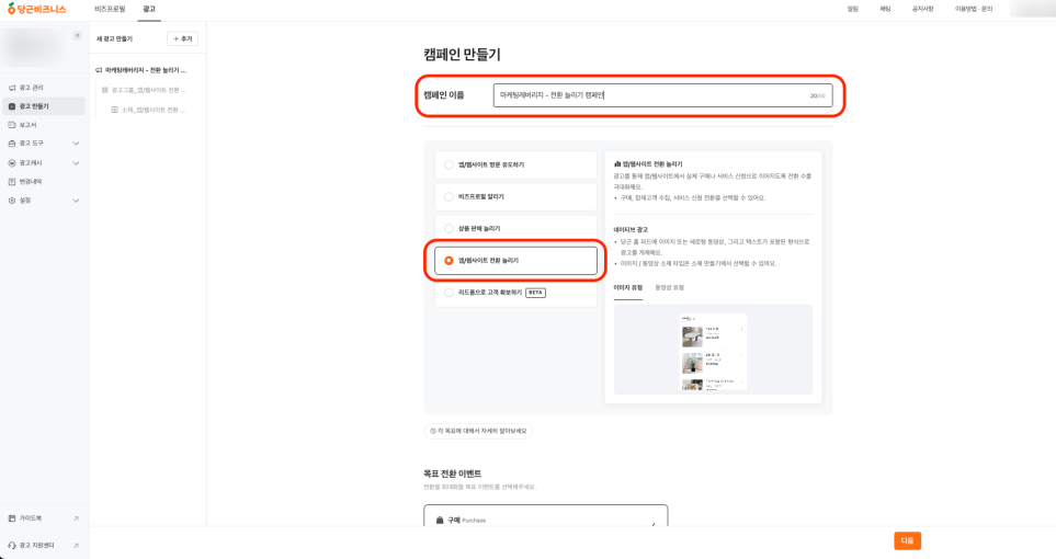 [전환 늘리기] 캠페인처럼 세팅해 주시면 됩니다.