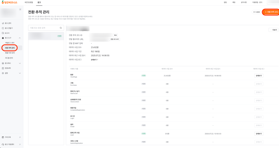 우측 상단 [+ 전환 추적 코드 추가] 버튼 클릭.