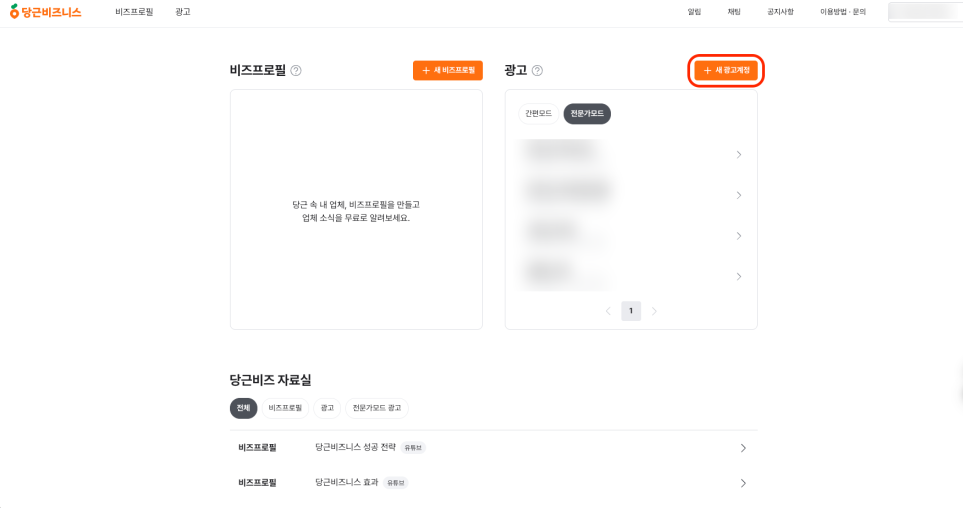홈 화면에서 [+ 새 광고계정] 버튼을 클릭하면