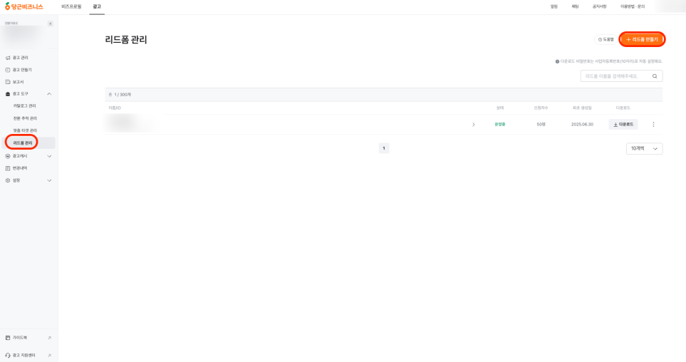 우측 상단 [+ 리드폼 만들기] 버튼을 클릭해 주세요.