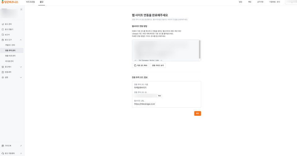 그러면 위 이미지와 같이 전환 추적 코드가 나옵니다.