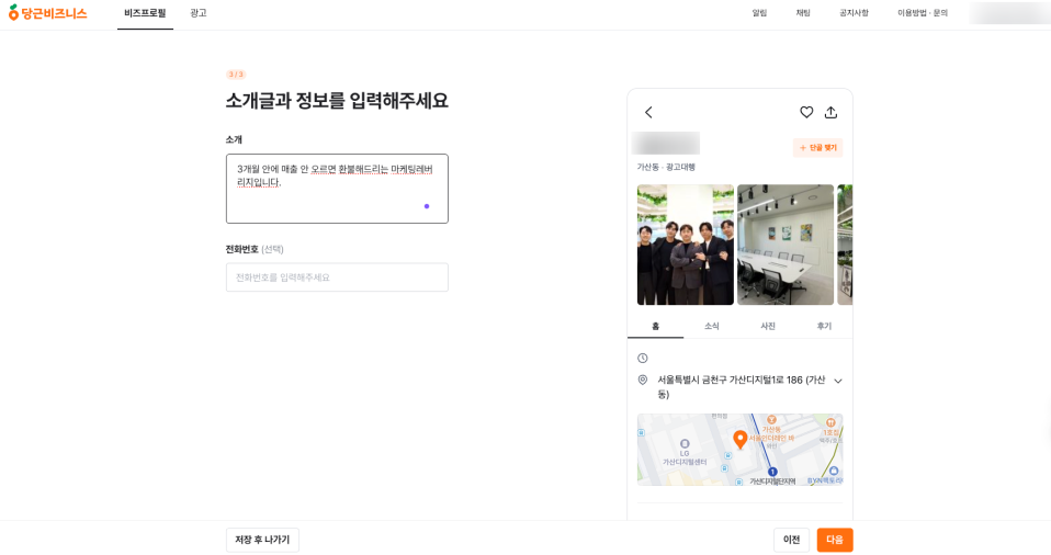 사진, 소개 글, 전화번호까지 업로드할 수 있습니다.