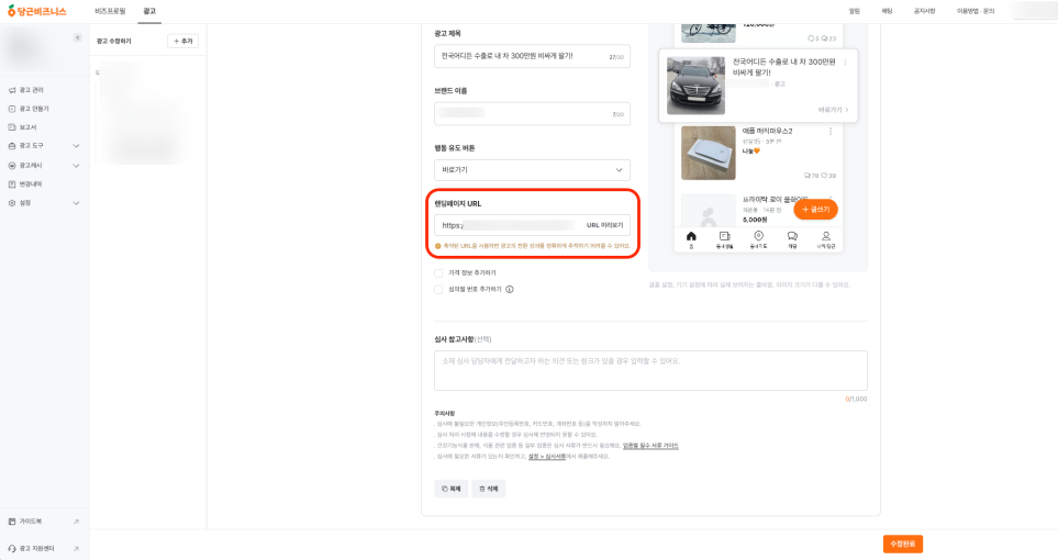 랜딩페이지 URL : 연결시킬 웹사이트 링크를 넣어주세요.