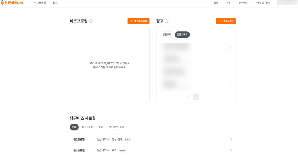 위 이미지처럼 [비즈프로필], [광고] 이렇게 2가지 탭이 있습니다.