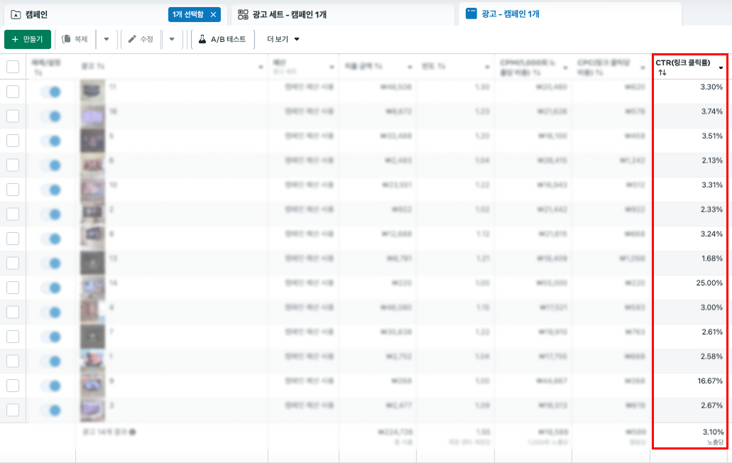 그래서 가장 먼저 우리 광고 소재, 썸네일의 클릭률을 확인하셔야 합니다.